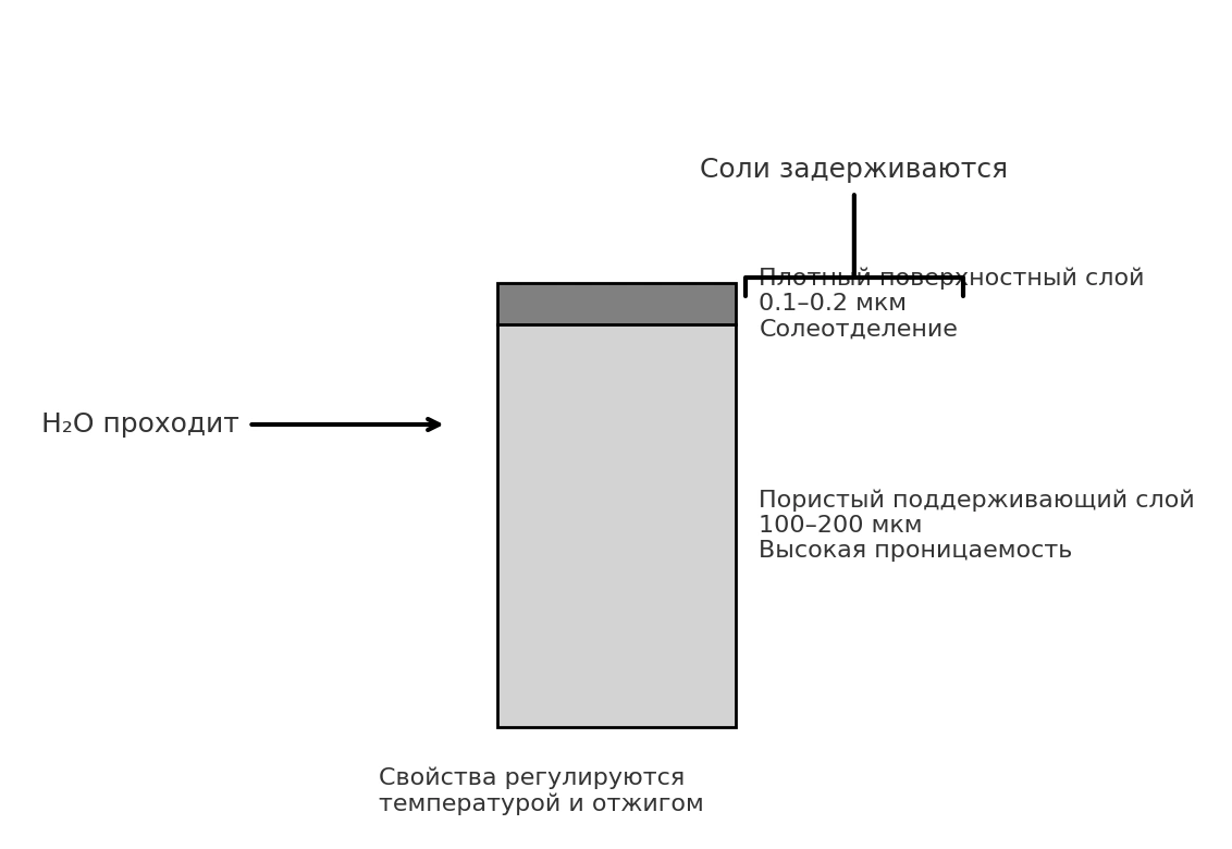 Полученная мембрана CA имеет асимметричную структуру с плотным поверхностным слоем около 0,1 - 0,2 мкм, который отвечает за свойство отвода солей. Остальная часть мембраны, толщиной 100-200 мкм. толщиной 100-200 мкм, механически поддерживает тонкий поверхностный слой, является губчатой и пористой, и имеет высокую водопроницаемость. проницаемость. Солеотделение и водный поток мембраны CA можно регулировать изменением температуры и продолжительности этапа отжига.