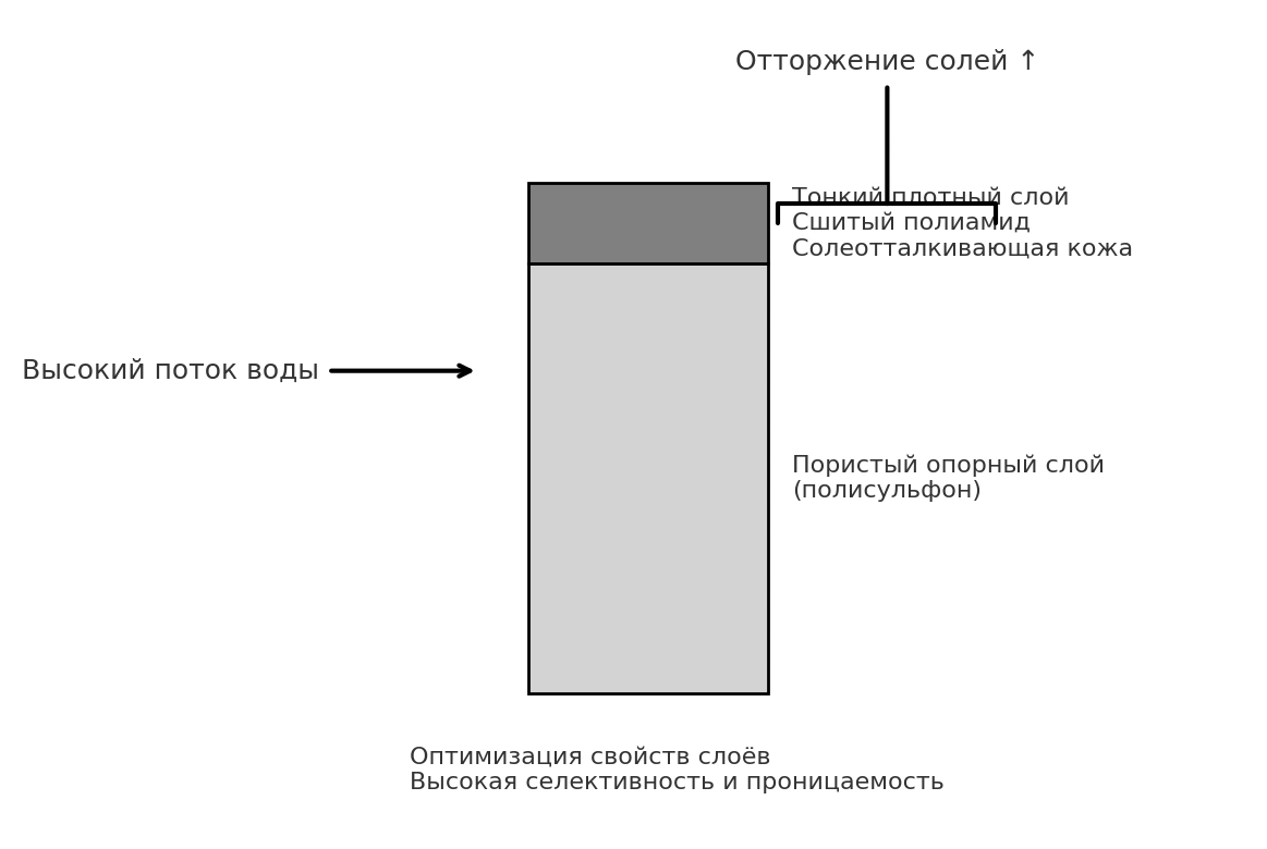 Тонкопленочные композитные (ТФК) полиамидные мембраны состоят из пористого опорного слоя и тонкого плотного слоя, который представляет собой поперечно связанную мембранную оболочку и формируется на пористом опорном слое, обычно изготовленном из полисульфона. Тонкопленочный плотный слой представляет собой сшитый ароматический полиамид, изготовленный из реакции межфазной полимеризации полифункционального амина, такого как м-фенилендиамин с полифункциональным хлоридом кислоты, таким как тримезоилхлорид. Эта процедура производства ТФК позволяет независимую оптимизацию различных свойств опорной и солеотталкивающей кожи. ТФК характеризуется более высоким удельным потоком воды и более высоким отторжением солей, чем мембраны из ацетата целлюлозы.